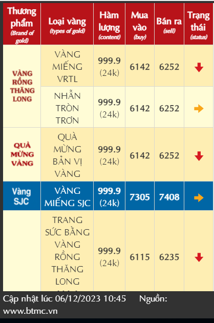 Tính đến 10h45 ngày 6/12, giá vàng nhẫn giao dịch tại Công ty Bảo Tín Minh Châu, giá trang sức bằng vàng rồng Thăng Long 999.9, nhẫn vàng trơn, Quà mừng vàng bản vị đều giao dịch quanh mức 61,48 - 62,53 triệu đồng/lượng (mua vào - bán ra), giảm 200 ngàn đồng chiều bán ra, giảm 300 ngàn đồng chiều mua vào so với ngày hôm qua.