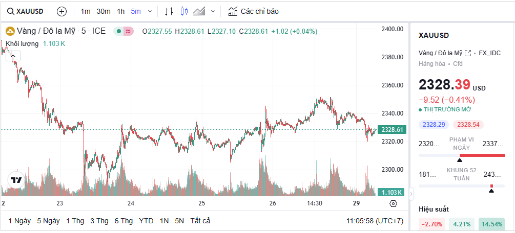 Thời điểm trưa hôm nay (ngày 29/4, giờ Việt Nam), giá vàng thế giới giao ngay đứng quanh ngưỡng 2.328 USD/ounce, giảm 7,8 USD/ounce so với kết tuần qua. Giá vàng giao tương lai tháng 6/2024 trên sàn Comex New York ở mức 2.338,7 USD/ounce.