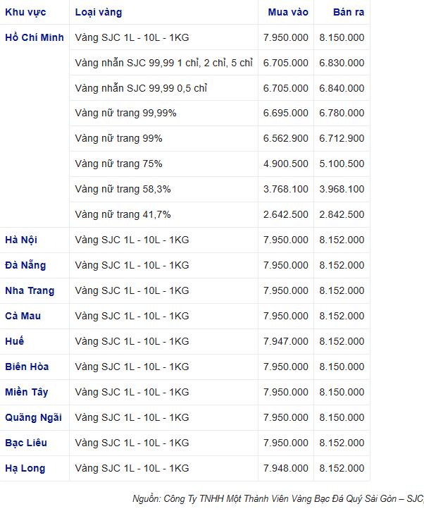Thời điểm trưa ngày 7/3, giá vàng SJC giao dịch tại Công ty Vàng bạc đá quý Sài Gòn khu vực TP. Hồ Chí Minh quanh mức 79,50 - 81,50, tăng 200 ngàn đồng/lượng chiều mua và tăng 200 ngàn đồng/lượng chiều bán so với chốt phiên hôm qua. Chênh lệch mua - bán lên đến 2 triệu đồng/lượng.