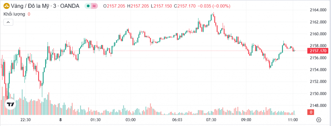 Cùng thời điểm trên, giá vàng giao ngay tại thị trường châu Á đứng ở mức 2.157 USD/oz, giảm 1,9 USD/oz, tương đương giảm 0,09%, so với đóng cửa phiên ngày thứ Tư tại thị trường Mỹ - theo dữ liệu từ sàn giao dịch Kitco.