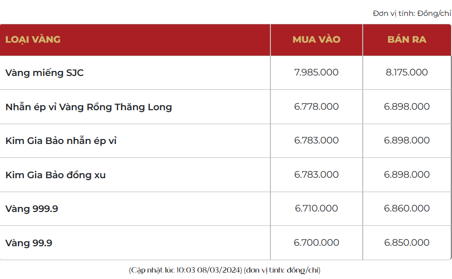 Tương tự, nhẫn ép vỉ Vàng Rồng Thăng Long, nhẫn ép vỉ Kim Gia Bảo đang giao dịch tại Công ty Bảo Tín Mạnh Hải quanh mức 67,78 - 68,98 triệu đồng/lượng mua vào - bán ra, tăng 150 ngàn đồng/lượng chiều mua, tăng 150 ngàn đồng/lượng chiều bán so với chốt phiên hôm qua.