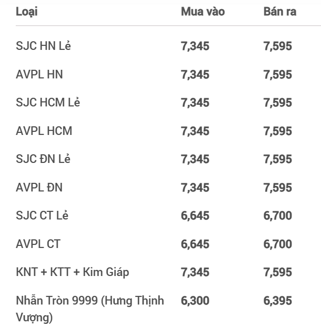 Vàng SJC tại Công ty Vàng bạc đá quý Sài Gòn hiện đang giao dịch từ 73,50-76,00 triệu đồng/lượng, giảm 200 ngàn đồng/lượng chiều mua vào và giảm 150 ngàn đồng/lượng chiều bán ra so với hôm qua. Tương tự, Công ty Vàng bạc Phú Quý giao dịch ở mức 73,65-73,95triệu đồng/lượng, giảm 250 ngàn đồng/lượng chiều mua vào và giảm 250 ngàn đồng/lượng chiều bán ra so với hôm qua.
