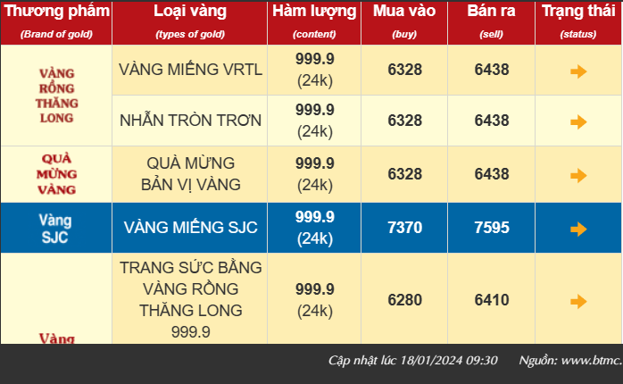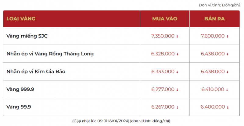 Vàng trang sức bằng Vàng rồng Thăng Long 999.9 (vàng 24k) của Công ty TNHH Bảo Tín Minh Châu giao dịch quanh mức 63,28 - 64,38 triệu đồng/lượng mua vào - bán ra, giảm 520 ngàn đồng/lượng chiều mua vào và giảm 500 ngàn đồng/lượng chiều bán ra so với hôm qua. Vàng trang sức bằng Vàng rồng Thăng Long 99.9 (vàng 24k) đang giao dịch quanh mức 62,80 - 64,10 triệu đồng/lượng mua vào - bán ra, giảm 350 ngàn đồng/lượng chiều mua vào và tăng 250 ngàn đồng/lượng chiều bán ra so với ngày hôm qua.