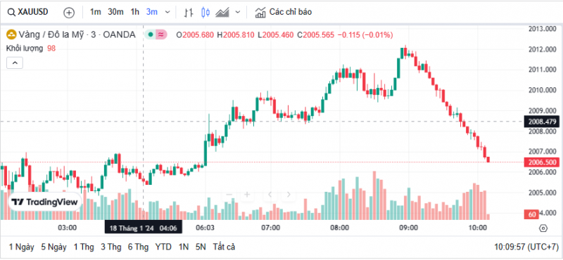 Giá vàng tiếp tục giảm trong phiên giao dịch hôm nay, sau khi báo cáo kinh tế Mỹ tốt hơn kỳ vọng của thị trường. Bên cạnh đó, doanh số bán lẻ tháng 12/2023 của Mỹ tăng 0,6%, cao hơn 0,2 điểm % so với dự báo là tăng 0,4%. Hiện giá vàng thế giới chạm mức thấp nhất trong 5 tuần.