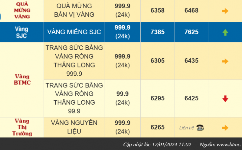 Vàng trang sức bằng Vàng rồng Thăng Long 999.9 (vàng 24k) của Công ty TNHH Bảo Tín Minh Châu giao dịch quanh mức 63,88 - 64,98 triệu đồng/lượng mua vào - bán ra, tăng 80 ngàn đồng/lượng chiều mua vào và tăng 90 ngàn đồng/lượng chiều bán ra so với hôm qua. Vàng trang sức bằng Vàng rồng Thăng Long 99.9 (vàng 24k) đang giao dịch quanh mức 63,05 - 64,35 triệu đồng/lượng mua vào - bán ra, giảm 250 ngàn đồng/lượng chiều mua vào và tăng 220 ngàn đồng/lượng chiều bán ra so với ngày hôm qua.