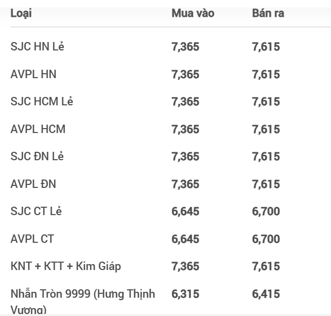 Vàng SJC tại Công ty Vàng bạc đá quý Sài Gòn hiện đang giao dịch từ 73,70-76,20 triệu đồng/lượng, giảm 50 ngàn đồng/lượng chiều mua vào và giảm 50 ngàn đồng/lượng chiều bán ra so với hôm qua. Tương tự, Công ty Vàng bạc Phú Quý giao dịch ở mức 73,80-76,20 triệu đồng/lượng, giảm 100 ngàn đồng/lượng chiều mua vào và giảm 80 ngàn đồng/lượng chiều bán ra so với hôm qua.