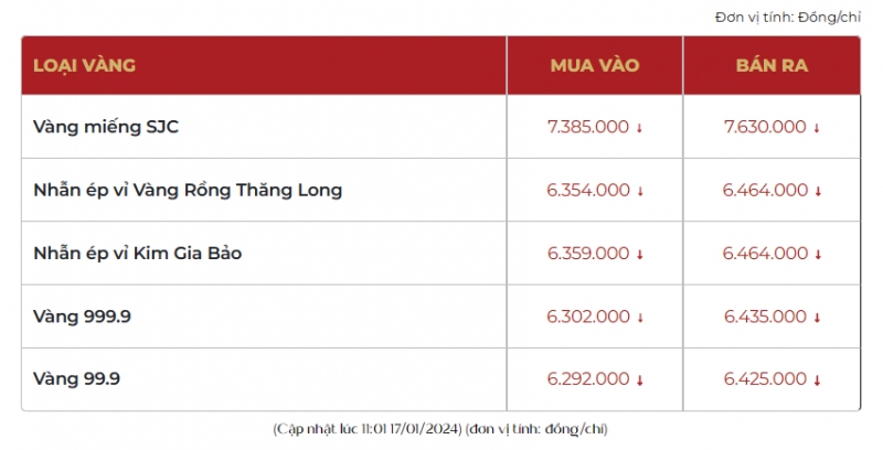 Thời điểm 11h00 sáng ngày 17/1/2024, giá vàng SJC tại Công ty Doji Hà Nội giao dịch ở mức 73,65-76,15 triệu đồng/lượng mua vào - bán ra, giảm 100 ngàn đồng/lượng chiều mua vào và giảm 100 ngàn đồng/lượng chiều bán ra so với ngày hôm qua.