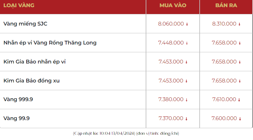 Trang sức bằng vàng rồng Thăng Long 999.9 (24k) đang giao dịch quanh mức 73,80 - 76,10 triệu đồng/lượng, giảm 700 ngàn đồng/lượng chiều mua vào và giảm 600 ngàn đồng/lượng chiều bán ra so ngày hôm qua.