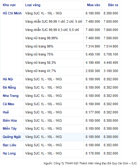 Giá tại Công ty Vàng bạc đá quý Sài Gòn khu vực Hà Nội quanh mức 81,80 - 83,82 triệu đồng/lượng, giảm 100 ngàn đồng/lượng chiều mua và giảm 100 ngàn đồng/lượng chiều bán so với hôm qua. Chênh lệch mua - bán là 2 triệu đồng/lượng.