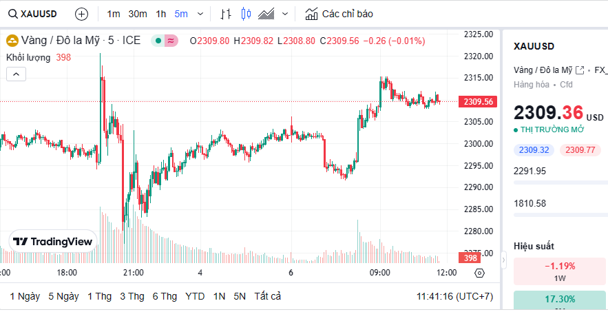 Thời điểm trưa nay (ngày 6/5), giá vàng thế giới giao dịch ở mức 2.308,5 USD/oz, tăng 6,3 USD/oz so với đóng cửa phiên ngày thứ Sáu tại Mỹ, tương đương tăng 0,25% - theo dữ liệu từ sàn giao dịch Kitco.