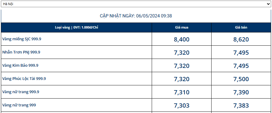 Giá vàng miếng SJC tăng mạnh và vượt xa mốc 86 triệu đồng/lượng. Đến thời điểm trưa ngày 6/5, giá vàng miếng SJC tại Tập đoàn Phú Quý được giao dịch mua vào - bán ra quanh mức 83,80 - 86,00 triệu đồng/lượng, tăng 200 ngàn đồng/lượng chiều mua và tăng 100 ngàn đồng/lượng chiều bán so với ngày hôm qua.