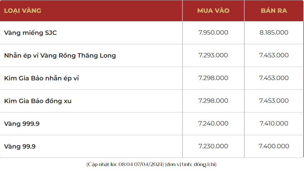 Thời điểm trưa ngày 7/4, giá vàng thế giới chưa có dấu hiệu ngừng tăng. Nhưng trái với giá vàng thế giới, giá vàng SJC lại giảm nhẹ. Hiện giá vàng SJC tại Công ty Vàng bạc đá quý Sài Gòn khu vực TP. Hồ Chí Minh giao dịch quanh mức 79,50 - 81,90 triệu đồng/lượng, giảm 100 ngàn đồng/lượng chiều mua và giảm 100 ngàn đồng/lượng chiều bán so với chốt phiên hôm qua. Chênh lệch mua - bán là 2,4 triệu đồng/lượng.
