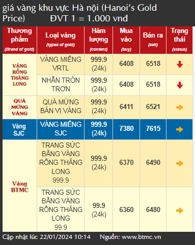 Thời điểm 11h ngày 22/1/2024, Công ty TNHH MTV Vàng Bạc Đá Quý Sài Gòn - SJC niêm yết giá vàng miếng SJC ở mức 73,5 triệu đồng/lượng mua vào và bán ra ở mức 76 triệu đồng/lượng. So với rạng sáng cùng ngày, giá vàng SJC tại đơn vị này đã được điều chỉnh giảm 200.000 đồng ở chiều mua và giảm 720.000 đồng ở chiều bán.