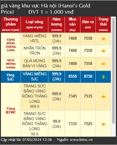 Thời điểm 13h ngày 7/5/2024, giá vàng SJC trong nước lại tăng vọt, lập đỉnh mới với giá bán ra 87,5 triệu đồng/lượng.