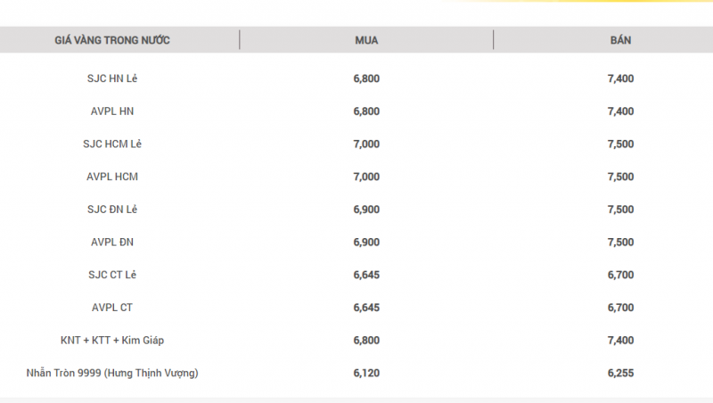 Cùng thời điểm, giá vàng SJC được niêm yết tại DOJI ở mức 68 triệu đồng/lượng mua vào và 74 triệu đồng/lượng bán ra. So với rạng sáng, giá vàng tại cơ sở này giữ nguyên mức giá. Tuy nhiên chênh lệch giá mua bán tại đơn vị này lên tới 6 triệu đồng/lượng.