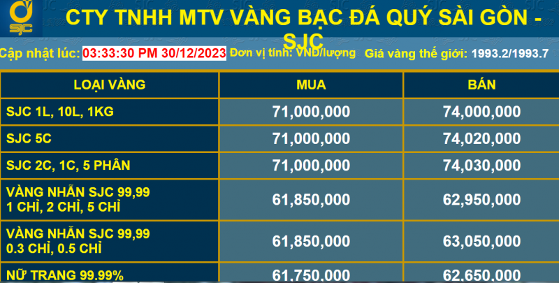 Thời điểm 12h trưa ngày 31/12/2023, giá vàng SJC được Công ty TNHH MTV Vàng Bạc Đá quý niêm yết ở mức 71 triệu đồng/lượng mua vào và 74 triệu đồng/lượng bán ra. Chênh lệch giá mua bán của đơn vị này đang ở mức 3 triệu đồng/lượng. So với rạng sáng, giá vàng tại cơ sở này chỉ giảm 20.000 đồng ở chiều bán ra.