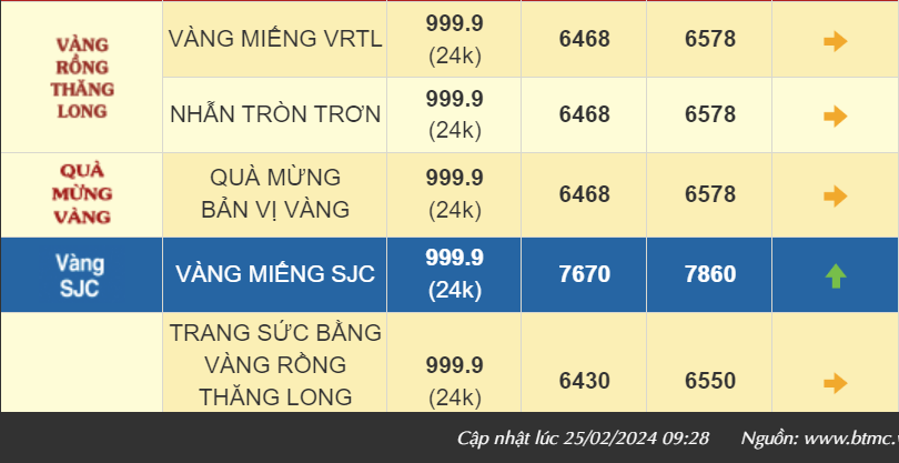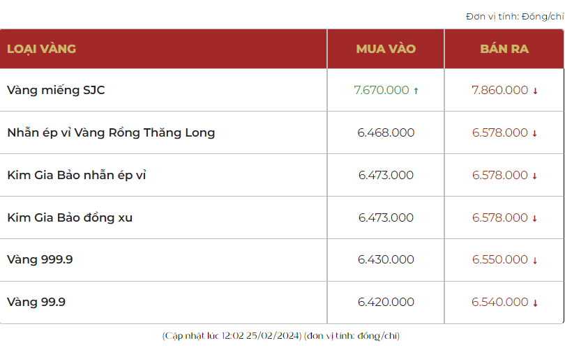 Giá vàng giao dịch lúc trưa ngày 24/2, giá vàng SJC được Tập đoàn DOJI giao dịch ở mức giá 76,50 - 78,65 triệu đồng/lượng, tăng 50 ngàn đồng/lượng chiều mua và tăng 50 ngàn đồng/lượng chiều bán so với chốt phiên hôm qua.