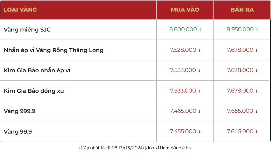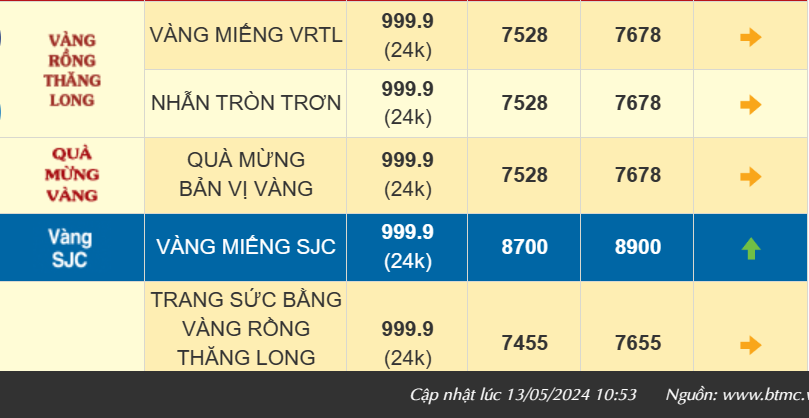 Giá vàng thời điểm trưa ngày 13/5, tại thị trường trong nước, giá vàng miếng SJC giảm nhẹ so với ngày hôm qua.