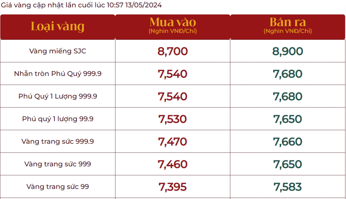 | Giá vàng giao dịch tại Tập đoàn Phú Quý |