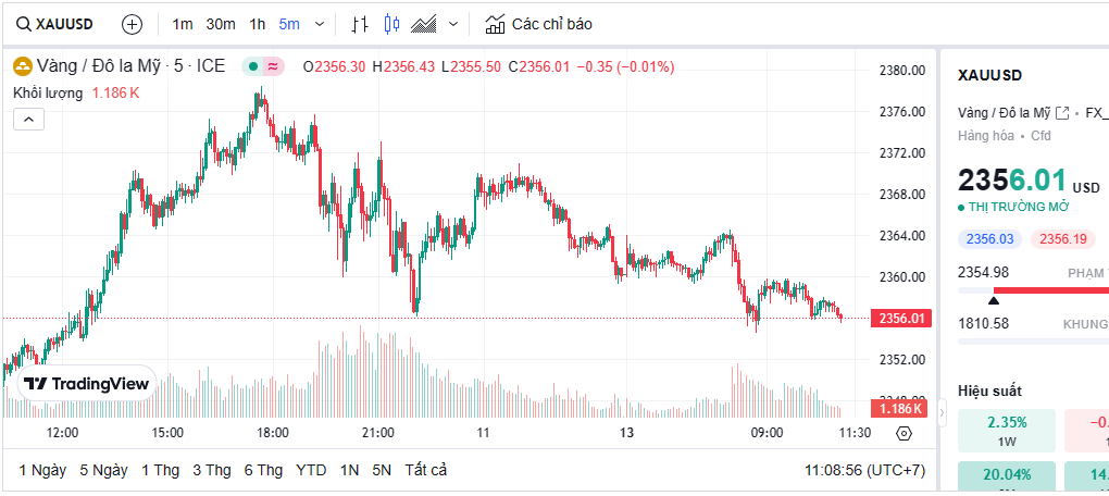 Giá vàng thế giới thời điểm trưa ngày 13/5, giá vàng giao ngay tại thị trường châu Á đứng ở mức 2.356 USD/oz, giảm 4,7 USD/oz so với đóng cửa cuối tuần trước tại New York - theo dữ liệu từ sàn giao dịch Kitco.