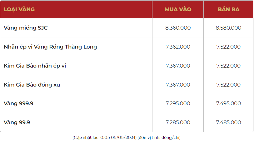 Giá vàng miếng SJC tăng nhẹ tùy từng doanh nghiệp. Đến thời điểm trưa ngày 5/5, giá vàng miếng SJC tại Tập đoàn Phú Quý được giao dịch mua vào - bán ra quanh mức 83,60 - 85,90 triệu đồng/lượng, tăng 100 ngàn đồng/lượng chiều mua và tăng 100 ngàn đồng/lượng chiều bán so với ngày hôm qua.