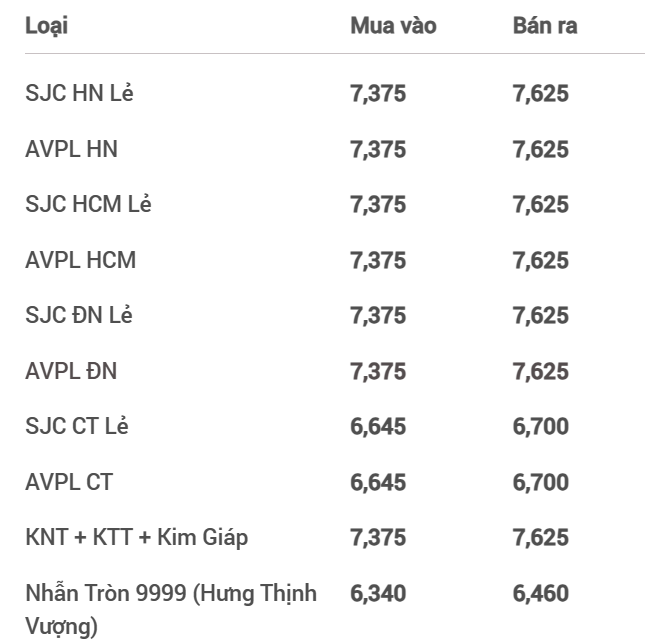 Vàng SJC tại Công ty Vàng bạc đá quý Sài Gòn hiện đang giao dịch từ 73,80-76,30 triệu đồng/lượng, tăng 100 ngàn đồng/lượng chiều mua vào và tăng 100 ngàn đồng/lượng chiều bán ra so với ngày hôm qua. Tương tự, Công ty Vàng bạc Phú Quý giao dịch ở mức 73,80-76,20 triệu đồng/lượng, tăng 50 ngàn đồng/lượng chiều mua vào và tăng 50 ngàn đồng/lượng chiều bán ra so với hôm qua.