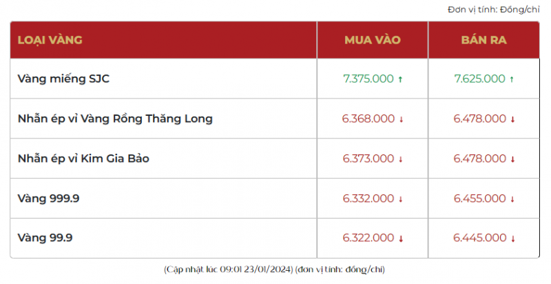 Thời điểm 10h00 sáng ngày 23/1/2024, giá vàng SJC tại Công ty Doji Hà Nội giao dịch ở mức 73,75-76,25 triệu đồng/lượng mua vào - bán ra, tăng 100 ngàn đồng/lượng chiều mua vào và tăng 100 ngàn đồng/lượng chiều bán ra so với ngày hôm qua.