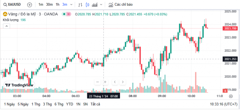 Giá vàng thế giới sáng nay lúc 10h30 giảm nhẹ với vàng giao ngay giảm 8,6 USD xuống 2.023,7 USD/ounce. Vàng tương lai giao dịch lần cuối ở mức 2.021,9 USD/ounce, giảm 7,4 USD so với rạng sáng qua.