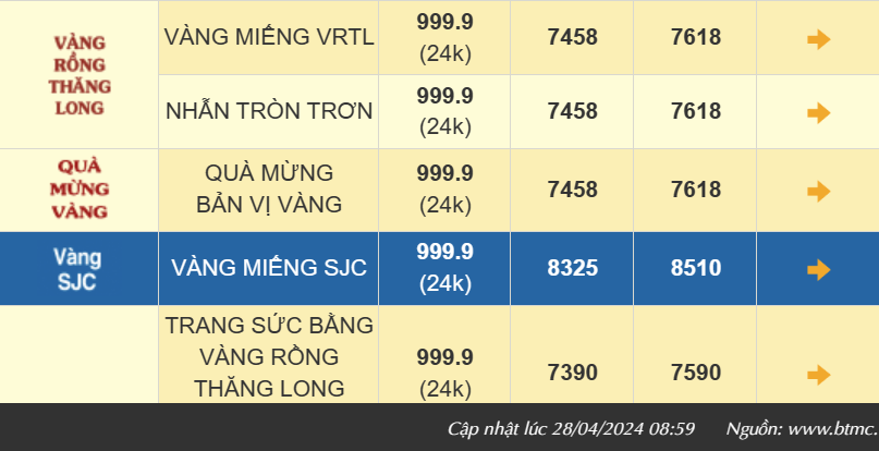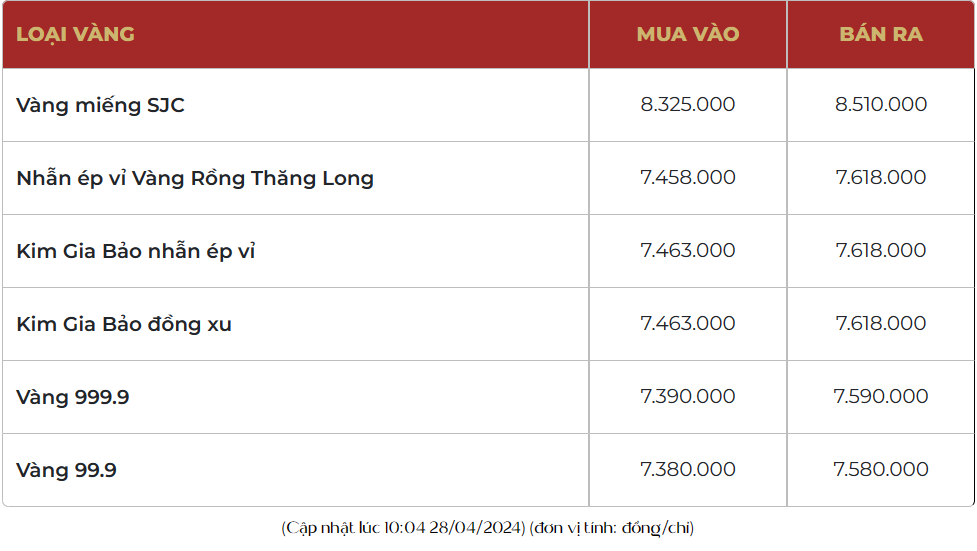 Giá vàng miếng SJC đứng yên trong ngày nghỉ lễ. Đến thời điểm trưa ngày 28/4, giá vàng miếng tại các doanh nghiệp được niêm yết cụ thể như sau:
