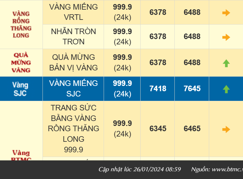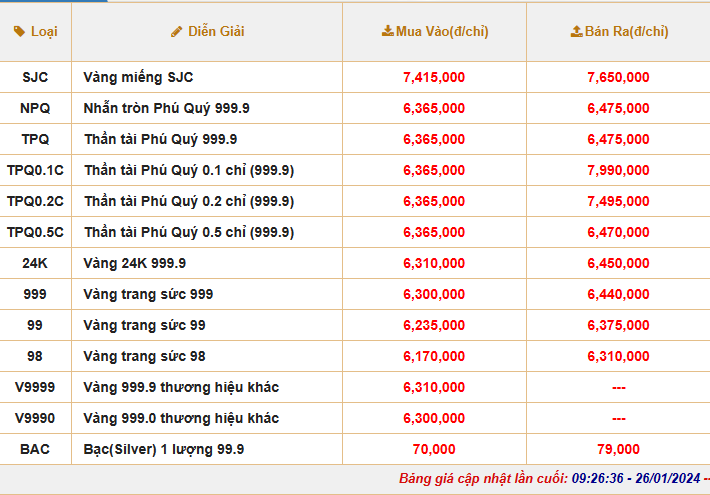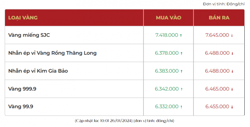 Thời điểm 10h00 sáng ngày 26/1/2024, giá vàng SJC tại Công ty Doji Hà Nội giao dịch ở mức 73,95-76,45 triệu đồng/lượng mua vào - bán ra, bằng giá chiều mua vào và bằng giá chiều bán ra so với ngày hôm qua.