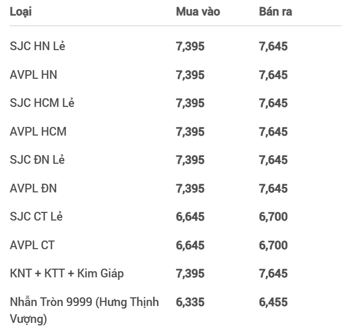 Vàng SJC tại Công ty Vàng bạc đá quý Sài Gòn hiện đang giao dịch từ 74,00-76,50 triệu đồng/lượng, bằng giá chiều mua vào và giảm 20 ngàn đồng/lượng chiều bán ra so với ngày hôm qua. Tương tự, Công ty Vàng bạc Phú Quý giao dịch ở mức 74,15-76,50 triệu đồng/lượng, giảm 100 ngàn đồng/lượng chiều mua vào và giảm 100 ngàn đồng/lượng chiều bán ra so với hôm qua.