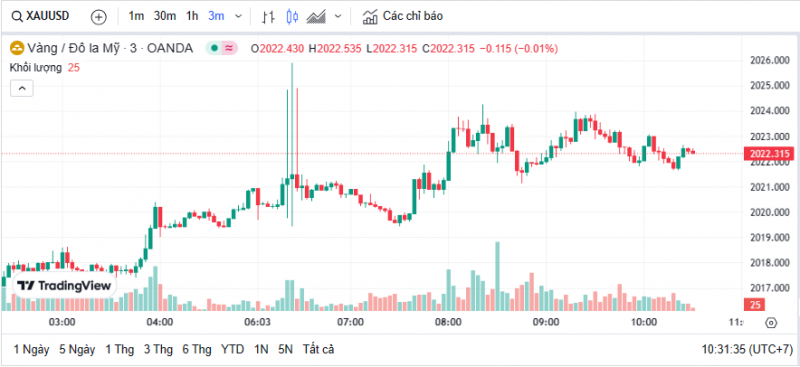 Giá vàng thế giới lúc 20h30 sáng nay nhích nhẹ với vàng giao ngay tăng 4,9 USD lên 2.022,3 USD/ounce. Vàng tương lai giao dịch lần cuối ở mức 2.021 USD/ounce, tăng 9 USD so với rạng sáng qua.