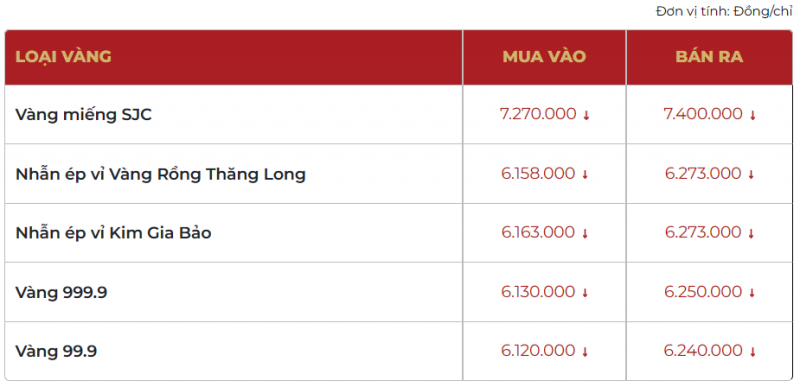 Vàng trang sức bằng vàng rồng Thăng Long 999.9 (vàng 24k) của doanh nghiệp này giao dịch quanh mức 61,30 - 62,50 triệu đồng/lượng mua vào - bán ra, giảm 200 ngàn chiều mua vào và giảm 300 ngàn bán ra so với ngày hôm qua. Vàng trang sức bằng Vàng rồng Thăng Long 99.9 (vàng 24k) đang giao dịch quanh mức 61,20 - 62,40 triệu đồng/lượng mua vào - bán ra, giảm 400 ngàn chiều mua vào và giảm 300 giảm chiều bán ra so với ngày hôm qua.