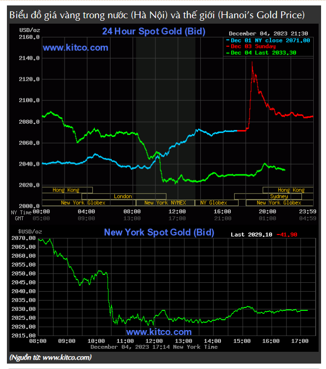 Chốt phiên 4/12, giá vàng thế giới giao ngay đứng tại 2.029 USD, giảm 42 USD so với cuối tuần trước. Tuy nhiên, nếu so với mức đỉnh đạt được ngay khi thị trường mở cửa, kim loại quý mất tới hơn 100 USD. Đây cũng là phiên tệ nhất của vàng kể từ tháng 2.