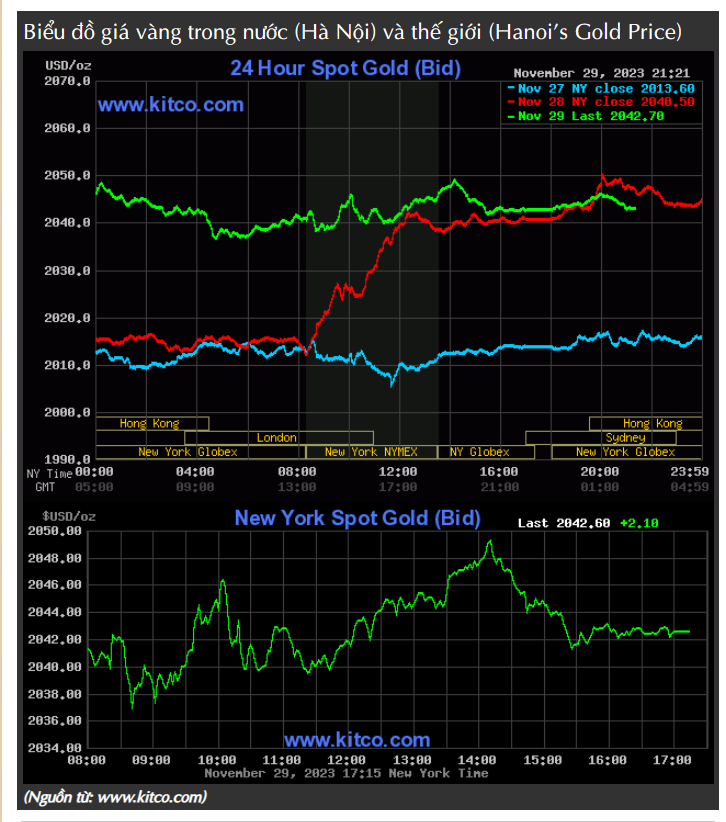 Trên thị trường thế giới, khoảng 6 giờ 30 ngày 30/11 (giờ Việt Nam), theo Kitco, giá vàng giao ngay ở mức 2.044,68 USD/ounce, tăng 0,23 USD/ounce (+0,01%). Vàng tương lai tháng 2 giao dịch lần cuối ở mức 2.065,2 USD/ounce, tăng 5 USD.