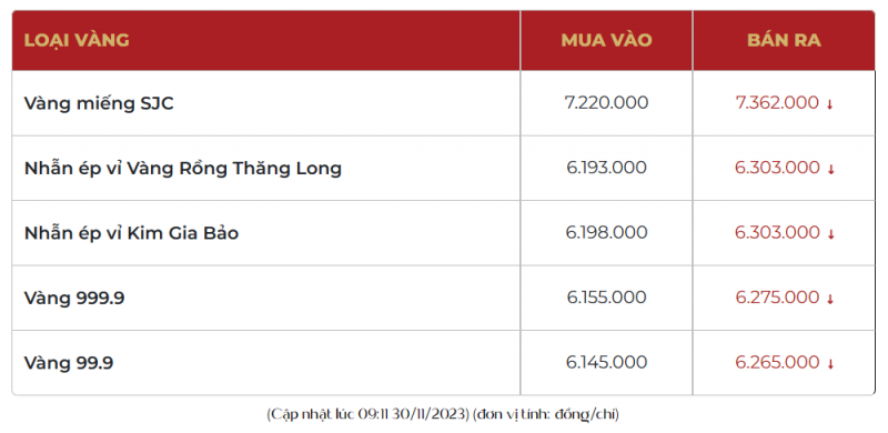 Tính đến 09h30 ngày 30/11, tại Công ty Bảo Tín Minh Châu, giá trang sức bằng vàng rồng Thăng Long 999.9, nhẫn vàng trơn, Quà mừng vàng bản vị đều giao dịch quanh mức 61,93 - 63,03 triệu đồng/lượng (mua vào - bán ra), tăng 700.000 đồng chiều bán ra, 400.000 đồng chiều mua vào so với ngày hôm qua.