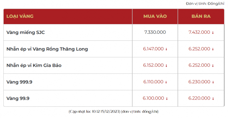 Vàng trang sức bằng Vàng rồng Thăng Long 999.9 (vàng 24k) của doanh nghiệp này giao dịch quanh mức 60,10 - 62,30 triệu đồng/lượng mua vào - bán ra. Vàng trang sức bằng Vàng rồng Thăng Long 99.9 (vàng 24k) đang giao dịch quanh mức 61,00 - 62,30 triệu đồng/lượng mua vào - bán ra, tăng 490 ngàn đồng/lượng chiều mua vào và bán ra so với ngày hôm qua.