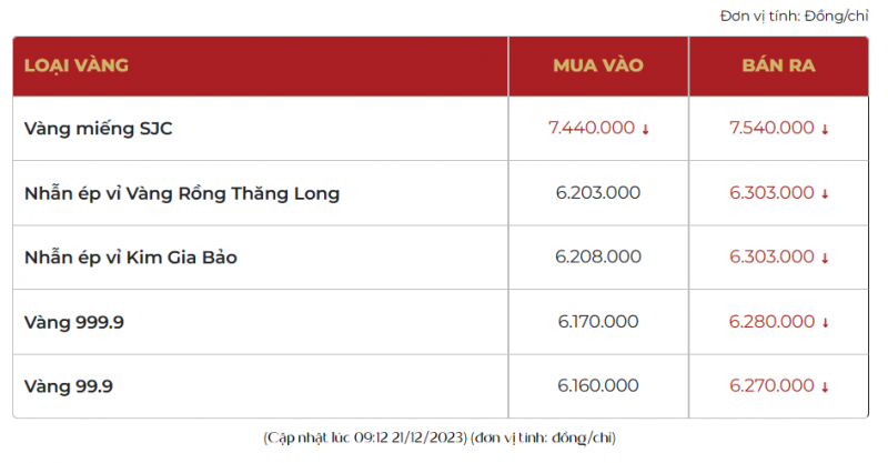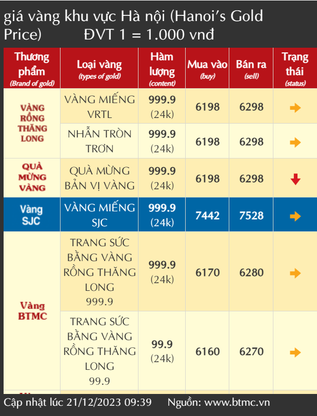 Vàng trang sức bằng Vàng rồng Thăng Long 999.9 (vàng 24k) của doanh nghiệp này giao dịch quanh mức 61,70 - 62,80 triệu đồng/lượng mua vào - bán ra, tăng 200 ngàn đồng chiều mua vào và 210 ngàn đồng chiều bán ra so với hôm qua. Vàng trang sức bằng Vàng rồng Thăng Long 99.9 (vàng 24k) đang giao dịch quanh mức 61,70 - 62,80 triệu đồng/lượng mua vào - bán ra, tăng 240 ngàn đồng chiều mua vào và 220 ngàn đồng chiều bán ra so với ngày hôm qua.