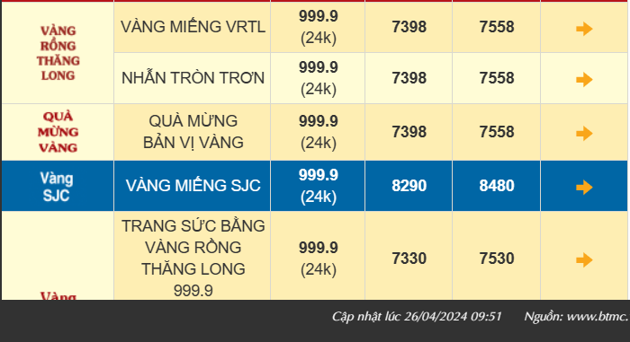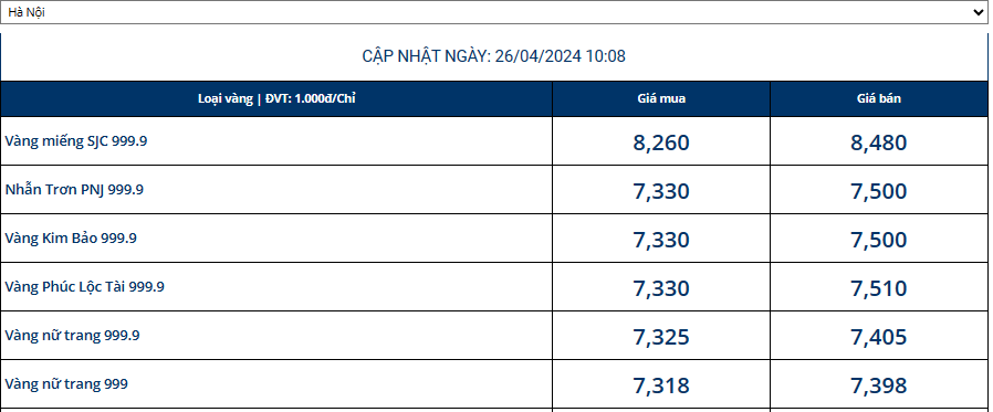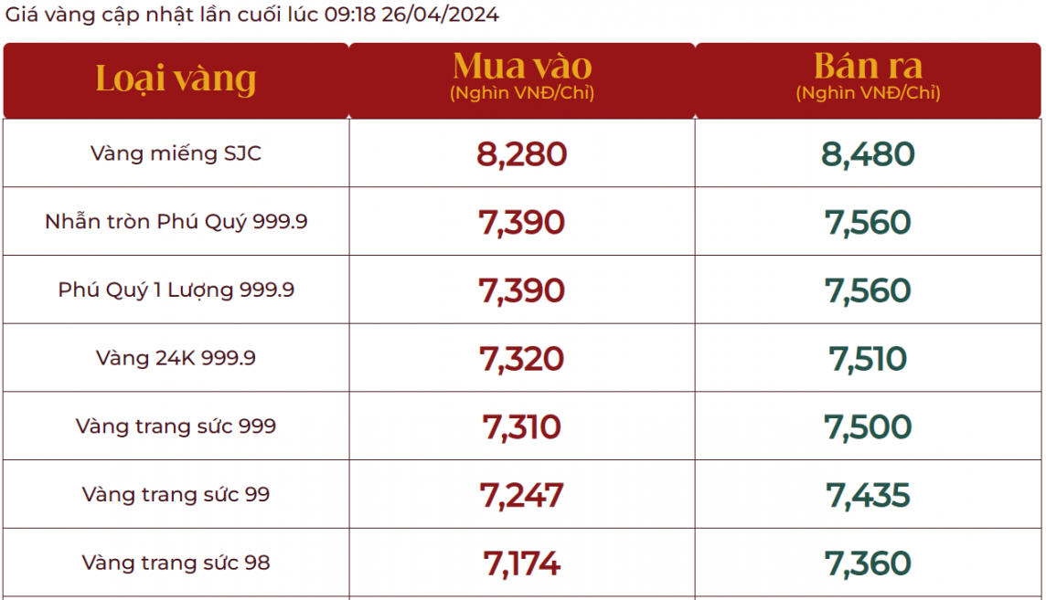 Tại thời điểm trưa ngày 26/4 (giờ Việt Nam), giá vàng thế giới giao ngay ở mức 2.325 USD/ounce. Quy đổi theo tỷ giá hiện hành tại Vietcombank, vàng thế giới có giá khoảng 69,962 triệu đồng/lượng (chưa tính thuế, phí). Với diễn biến hiện tại, giá vàng miếng SJC đang cao hơn vàng nhẫn khoảng 9 triệu đồng/lượng.