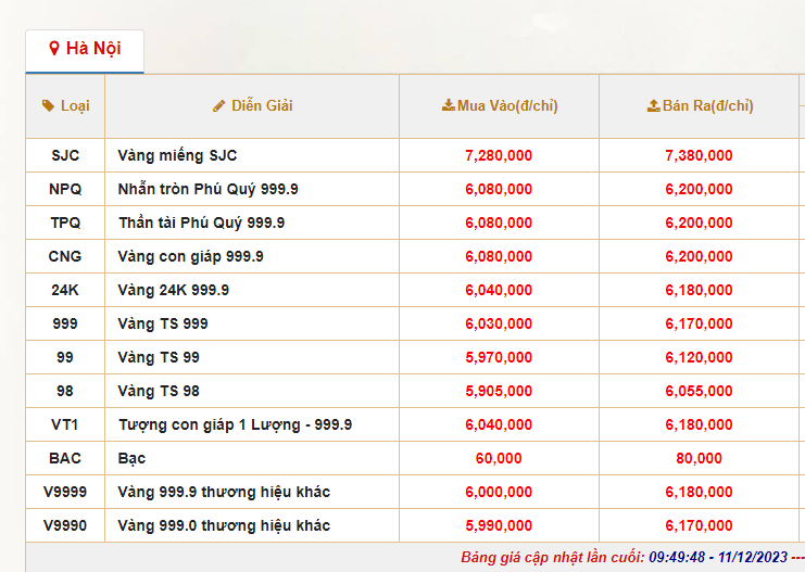 | Giá vàng niêm yết tại Phú Quý. Ảnh chụp màn hình lúc 10h ngày 11/12/2023 |