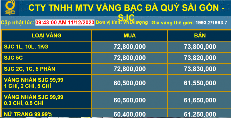 | Giá vàng niêm yết tại Công ty TNHH MTV Vàng Bạc Đá Quý Sài Gòn. Ảnh chụp màn hình lúc 10h ngày 11/12/2023 |