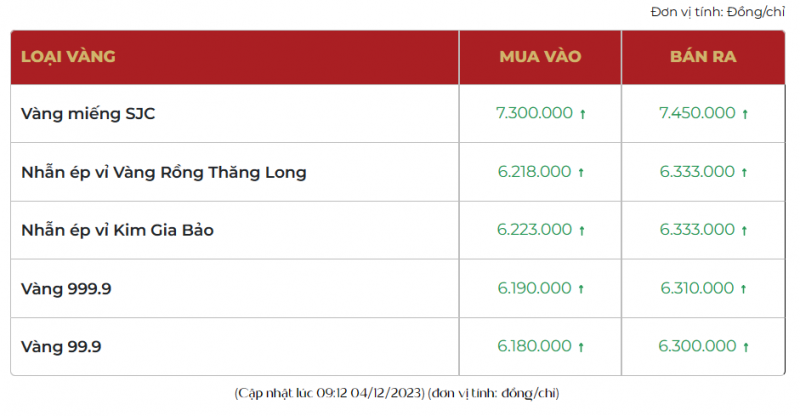 Tính đến 09h30 ngày 4/12, giá vàng SJC ngày càng tăng mạnh và chưa có dấu hiệu dừng lại. Hiện giá giao dịch tại một số hệ thống kinh doanh được niêm yết mua vào - bán như sau: Công ty Vàng bạc Đá quý Sài Gòn niêm yết cao nhất với giá mua vào bán ra 73,00 - 74,20 triệu đồng/lượng ra; Tập đoàn Doji niêm yết tại 73,00 - 74,50 triệu đồng/lượng; Hệ thống PNJ niêm yết tại 72,95 - 74,00 triệu đồng/lượng; Bảo Tín Minh Châu niêm yết giá mua vào bán ra 73,05 - 74,28 triệu đồng/lượng; Bảo Tín Mạnh Hải niêm yết tại 73,00 - 74,50 triệu đồng/lượng. So với ngày hôm qua, giá vàng SJC tăng mạnh khoảng 500.000 đồng chiều mua vào và 200.000 đồng chiều bán ra.