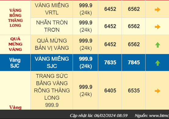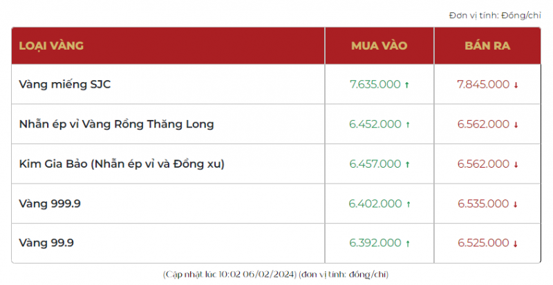 Thời điểm trưa ngày 6/2/2024, giá vàng SJC tại Công ty Doji Hà Nội giao dịch ở mức 76,35-78,65 triệu đồng/lượng mua vào - bán ra, tăng 400 ngàn đồng/lượng chiều mua vào và tăng 350 ngàn đồng/lượng chiều bán ra so với ngày hôm qua.