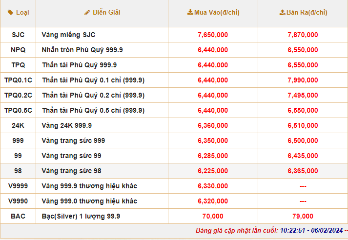 | Giá vàng giao dịch tại Công ty Vàng bạc Phú Quý |
