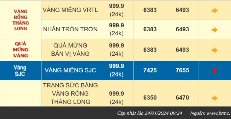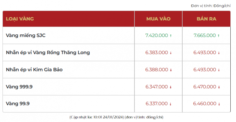 Thời điểm 10h30 sáng ngày 24/1/2024, giá vàng SJC tại Công ty Doji Hà Nội giao dịch ở mức 74,15-76,65 triệu đồng/lượng mua vào - bán ra, tăng 480 ngàn đồng/lượng chiều mua vào và tăng 400 ngàn đồng/lượng chiều bán ra so với ngày hôm qua.