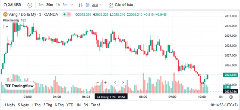 Khoảng 6 giờ 30 ngày 24/1 (giờ Việt Nam), trên Kitco, giá vàng giao ngay ở mức 2.025,00 USD/ounce, tăng 4,04 USD/ounce (+0,34%); vàng tương lai giao dịch lần cuối ở mức 2.030,6 USD/ounce, tăng 8,4 USD.