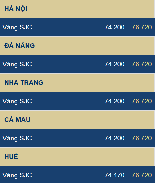 Vàng SJC tại Công ty Vàng bạc đá quý Sài Gòn hiện đang giao dịch từ 74,20-76,72 triệu đồng/lượng, tăng 400 ngàn đồng/lượng chiều mua vào và tăng 500 ngàn đồng/lượng chiều bán ra so với ngày hôm qua. Tương tự, Công ty Vàng bạc Phú Quý giao dịch ở mức 74,20-76,60 triệu đồng/lượng, tăng 400 ngàn đồng/lượng chiều mua vào và tăng 400 ngàn đồng/lượng chiều bán ra so với hôm qua.