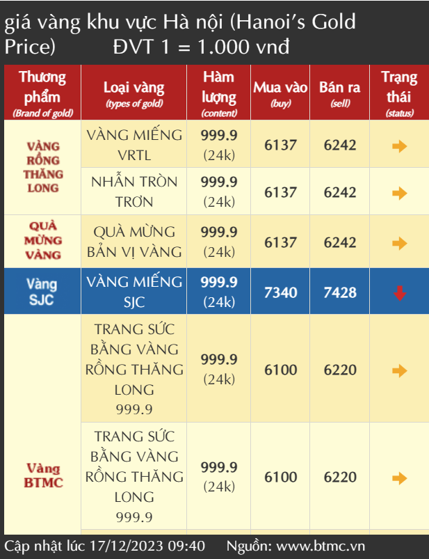 Vàng trang sức bằng Vàng rồng Thăng Long 999.9 (vàng 24k) của doanh nghiệp này giao dịch quanh mức 61,37 - 62,40 triệu đồng/lượng mua vào - bán ra, tăng 80 ngàn đồng chiều mua vào và 70 ngàn đồng chiều bán ra. Vàng trang sức bằng Vàng rồng Thăng Long 99.9 (vàng 24k) đang giao dịch quanh mức 61,00 - 62,20 triệu đồng/lượng mua vào - bán ra, bằng giá chiều mua vào và bán ra so với ngày hôm qua.