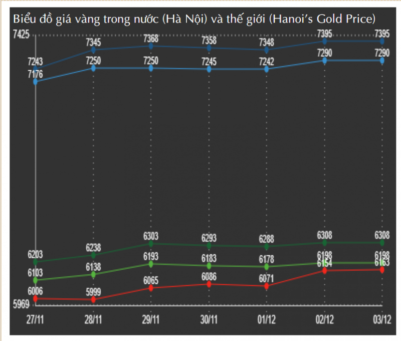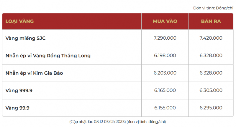 Tính đến 09h30 ngày 3/12, giá vàng SJC ngày càng tăng mạnh trở lại. Giá giao dịch tại một số hệ thống kinh doanh được niêm yết mua vào - bán như sau: Công ty Vàng bạc Đá quý Sài Gòn niêm yết cao nhất với giá mua vào bán ra 72,70 - 74,00 triệu đồng/lượng ra; Tập đoàn Doji niêm yết tại 72,30 - 74,00 triệu đồng/lượng; Hệ thống PNJ niêm yết tại 72,65 - 74,00 triệu đồng/lượng; Bảo Tín Minh Châu niêm yết giá mua vào bán ra 72,90 - 73,95 triệu đồng/lượng; Bảo Tín Mạnh Hải niêm yết tại 72,90 - 74,20 triệu đồng/lượng. So với ngày hôm qua, giá vàng SJC tăng mạnh trở lại khoảng 500.000 đồng chiều mua vào và 200.000 đồng chiều bán ra.