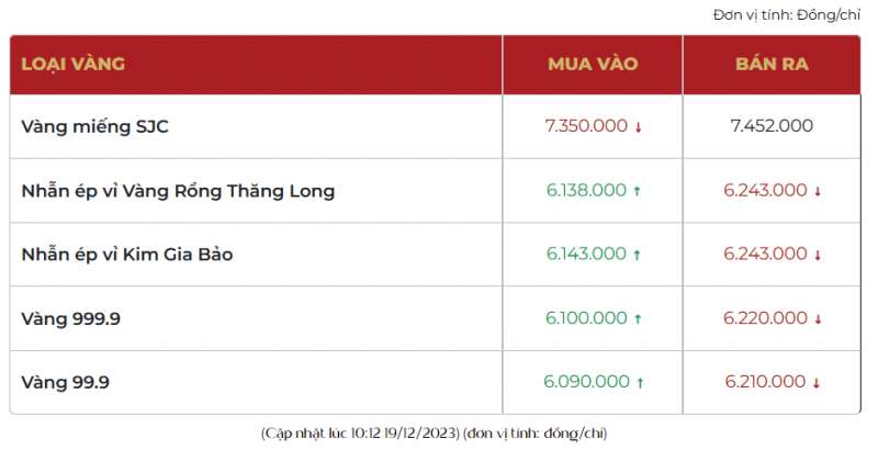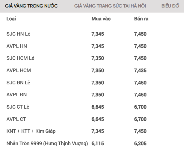 Vàng trang sức bằng Vàng rồng Thăng Long 999.9 (vàng 24k) của doanh nghiệp này giao dịch quanh mức 61,00 - 62,20 triệu đồng/lượng mua vào - bán ra, bằng giá chiều mua vào và chiều bán ra so với hôm qua. Vàng trang sức bằng Vàng rồng Thăng Long 99.9 (vàng 24k) đang giao dịch quanh mức 60,90 - 62,10 triệu đồng/lượng mua vào - bán ra, bằng giá chiều mua vào và bán ra so với ngày hôm qua.